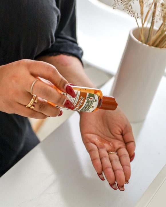 Jojoba oil has a variety of healing properties that may make it effective in treating skin conditions like acne, eczema, and psoriasis. You can enjoy its benefits by using it as a cleanser, moisturizer, or spot treatment. I like to incorporate Hollywood Beauty®Jojoba oil in my nighttime routine, but this can work when you wake up, too.